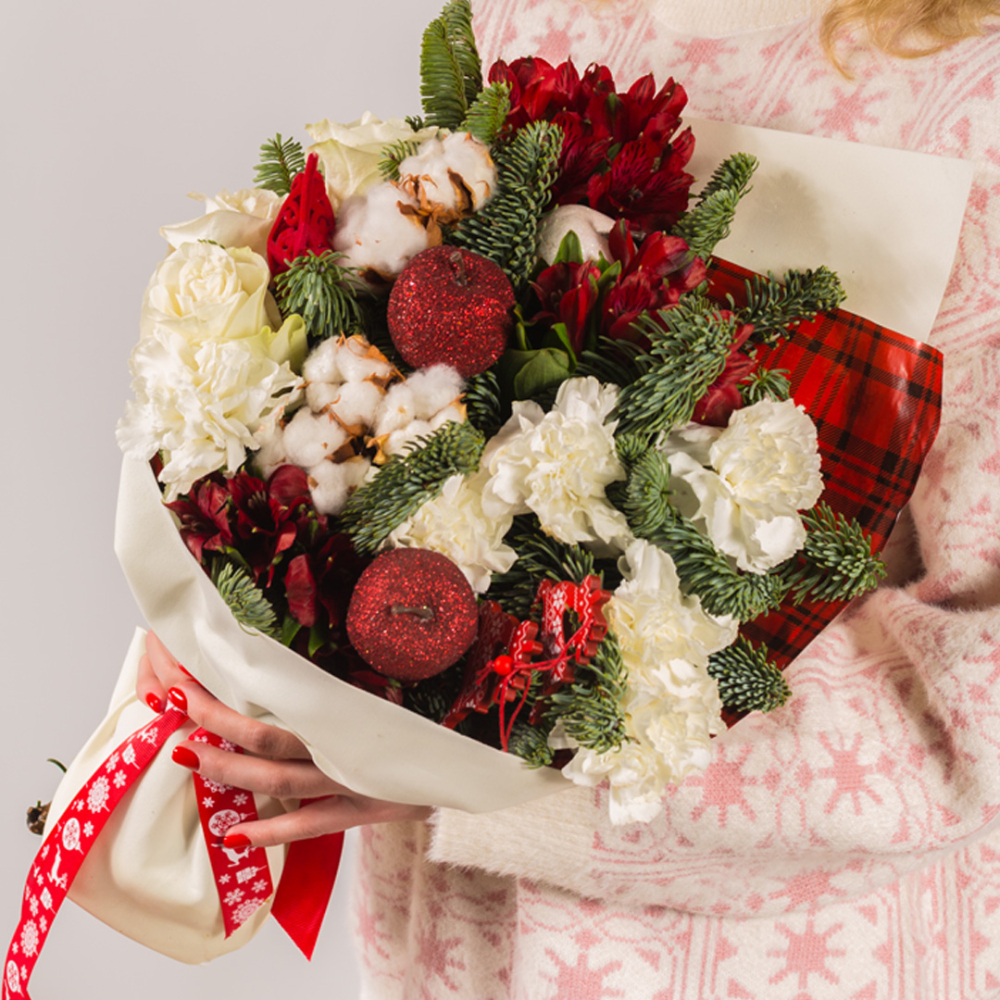 Чтобы цветы и еловые ветки дольше оставались свежими, подрежьте стебли роз и диантусов, поставьте букет в чистую воду и держите его подальше от батарей и прямого солнца. Хлопок и хвоя пихты нобилис долго сохраняют аккуратный вид, поэтому можно смело оформить цветы с доставкой.