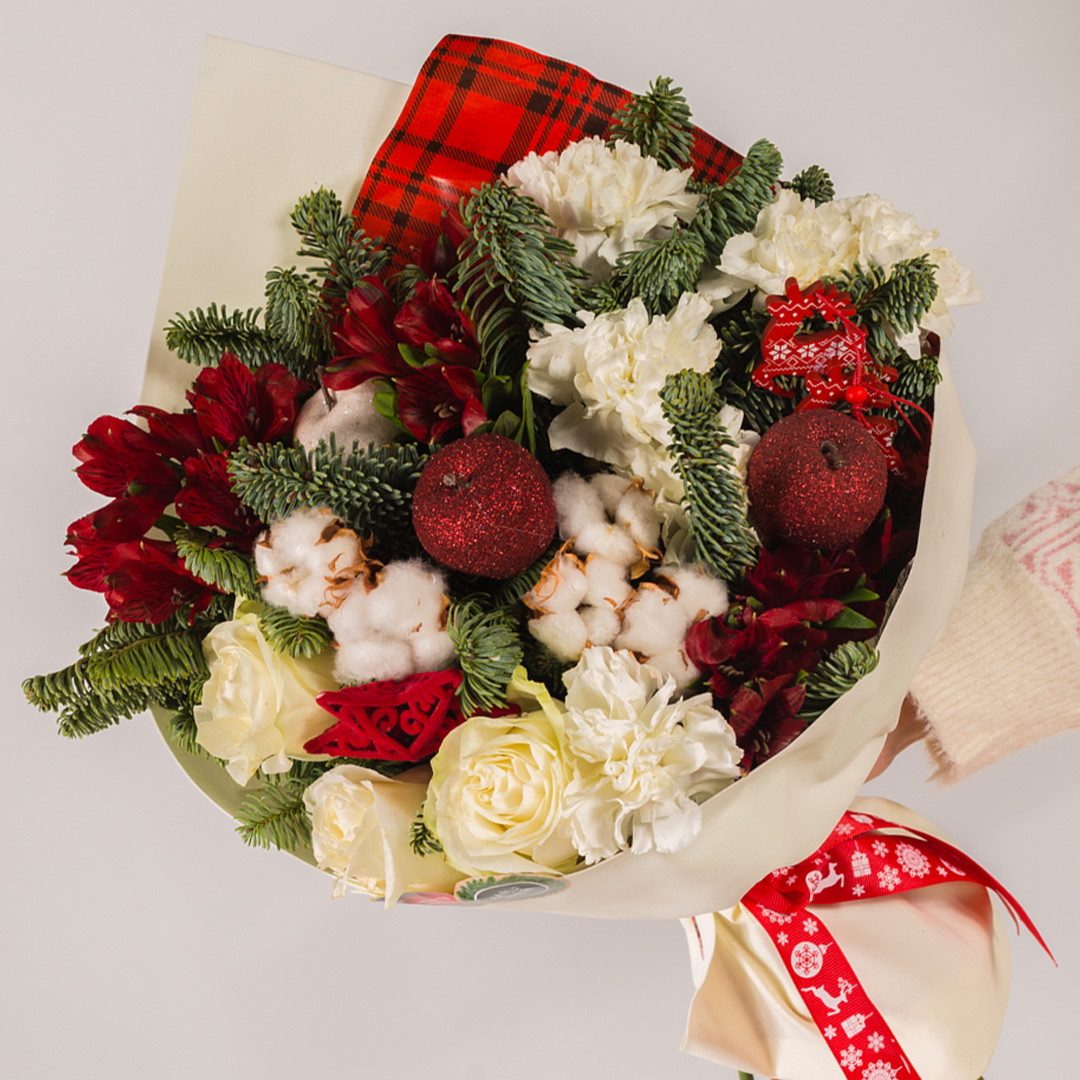 Такой букет с елкой подойдёт как поздравление на Новый год для мамы, подруги, коллеги или в качестве тёплой благодарности человеку, которому хочется сказать «я о тебе помню». Он уместен и дома, и в офисе, легко заменяет классический праздничный декор и сразу создаёт ощущение праздника в любой обстановке.
