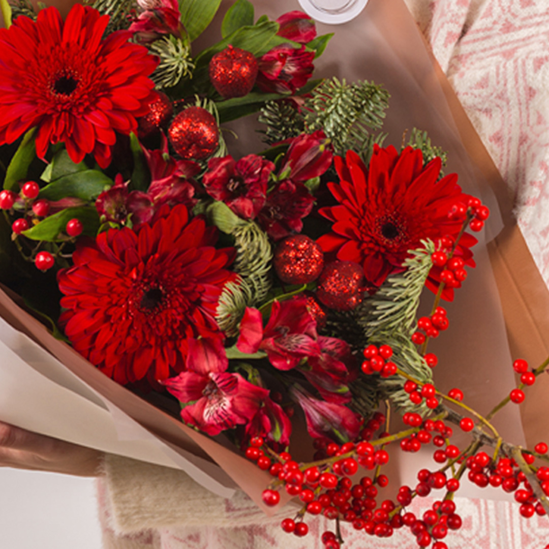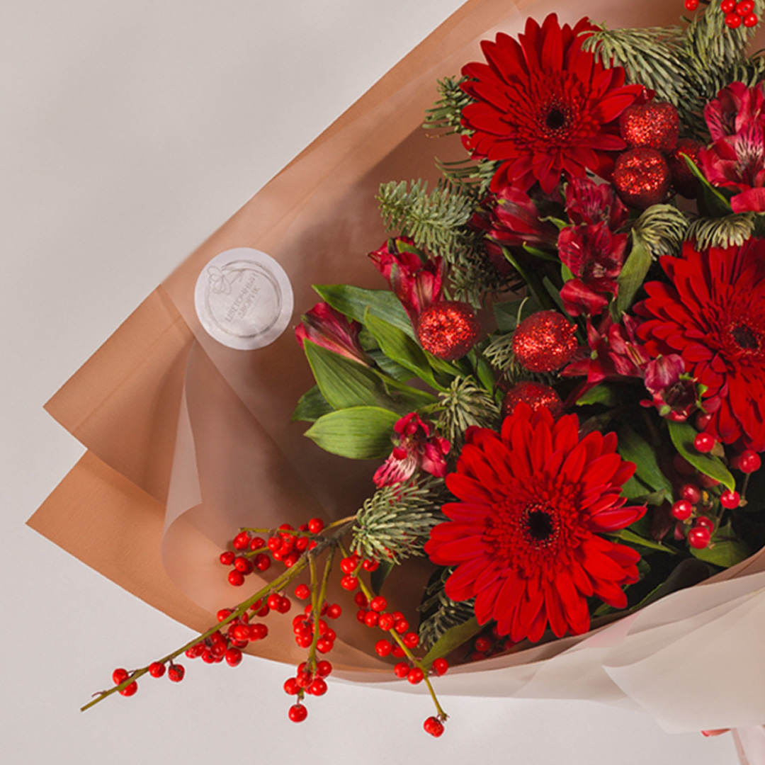 Нобилис придает букету свежесть и аромат хвои, создавая атмосферу зимнего леса. Красные гермини символизируют радость и энергию, добавляя яркие акценты в композицию. Илекс вносит элементы праздничного декора с яркими ягодами, подчеркивая новогоднюю тематику.