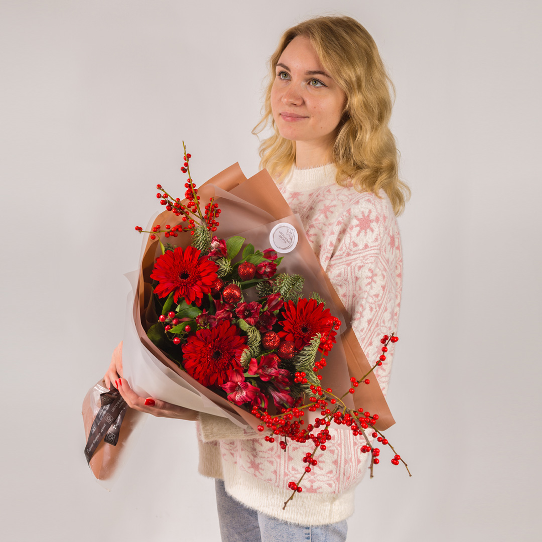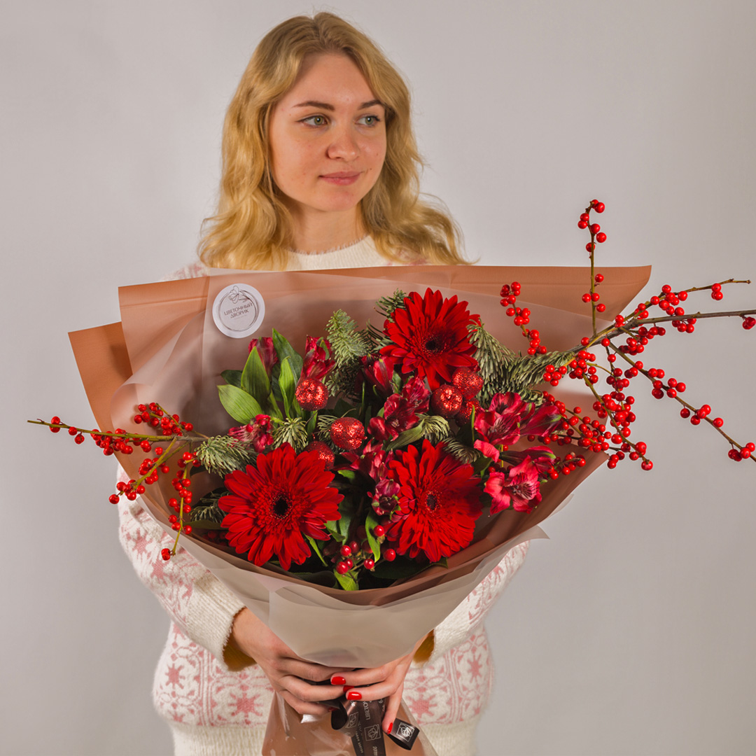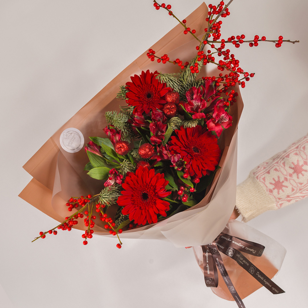 Букет с герберами, илексом и нобилисом "От Деда Мороза" N 72282
