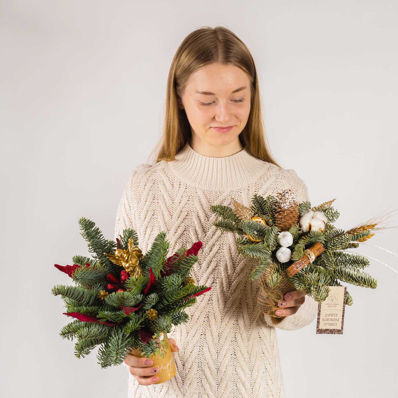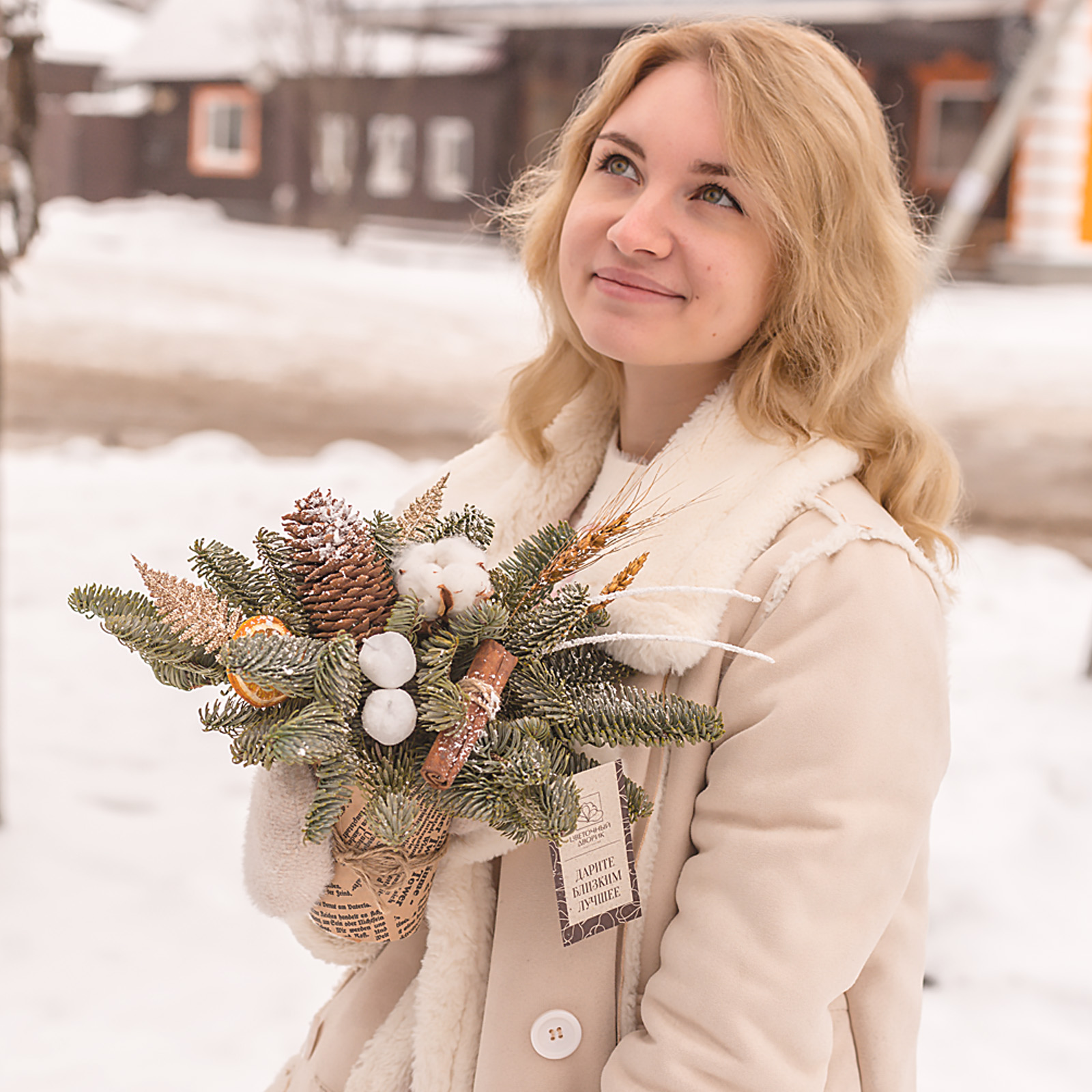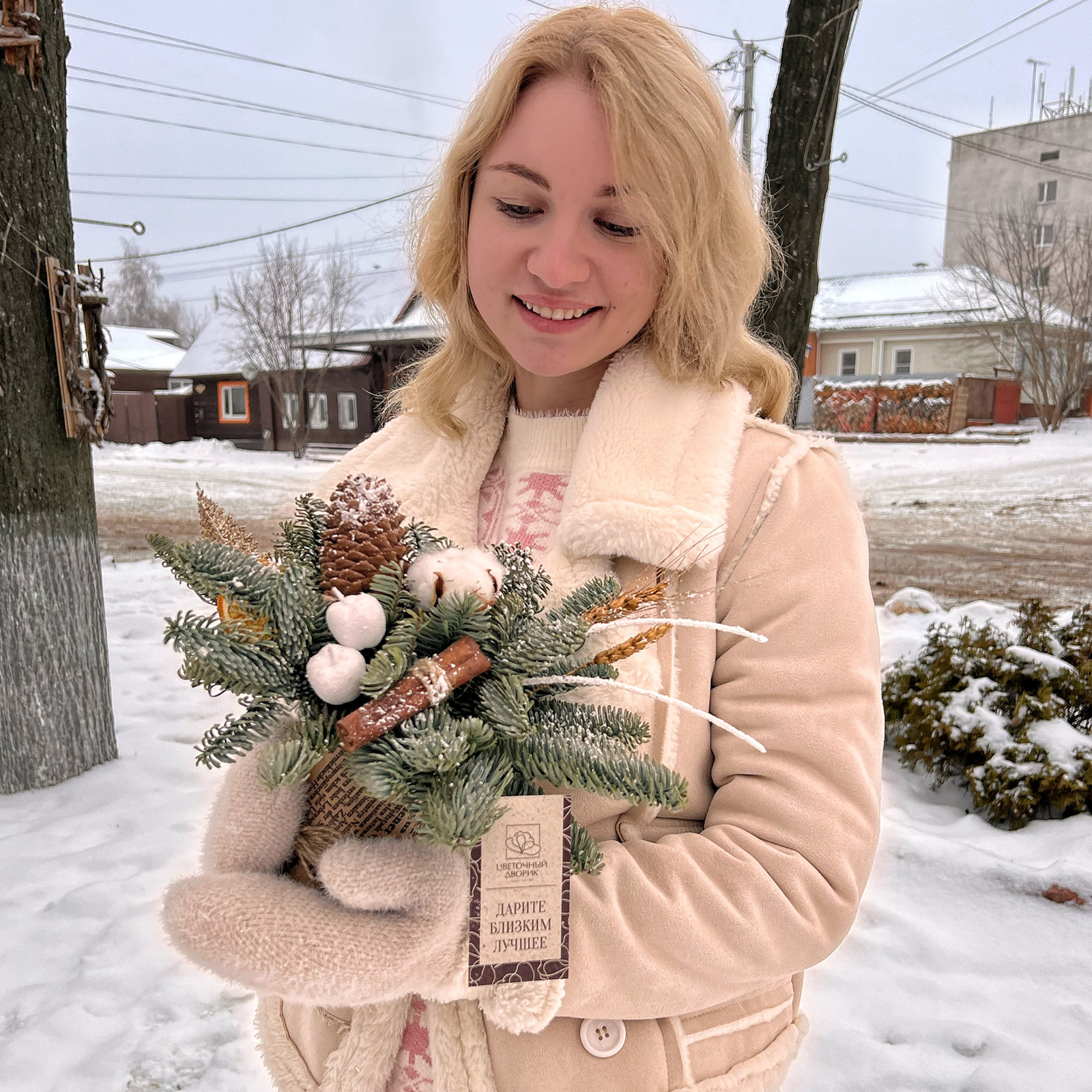 Чтобы еловые ветки дольше радовали, держите композицию подальше от батарей и прямого солнца, периодически поливайте прохладной водой. Сухие шишки, хлопок и корица долго сохраняют аккуратный вид, поэтому можно оформить цветы с доставкой заранее и не переживать о свежести - закажите прямо сейчас, и эта зимняя композиция будет у вас уже сегодня.