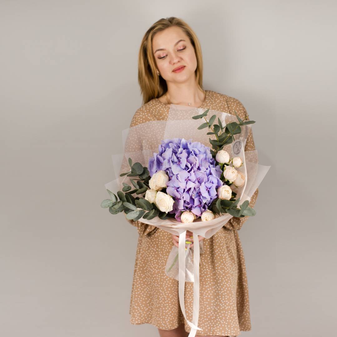 Букет из розовой гортензии с розами и мелкими ромашками арт. 66831-Р